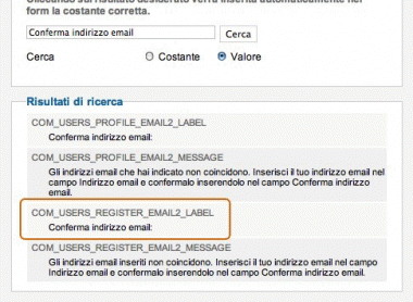 In questa maschera dobbiamo andare ad inserire la costante alla quale vogliamo modificare il testo associate, per far ciò dobbiamo scoprire come si chiama, nulla di più semplice, basta utilizzare il motore di ricerca integrato.